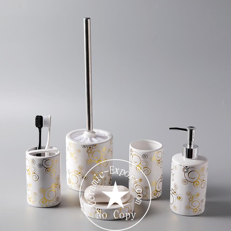 Wholesale Ceramic Bathroom Accessories Set 5 Geometry Decal White Gold