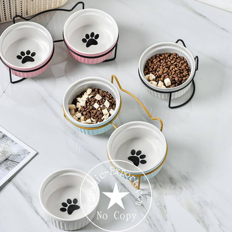 Wholesale Ceramic Pet Cat Bowls Paw Silk Print With Metal Stand